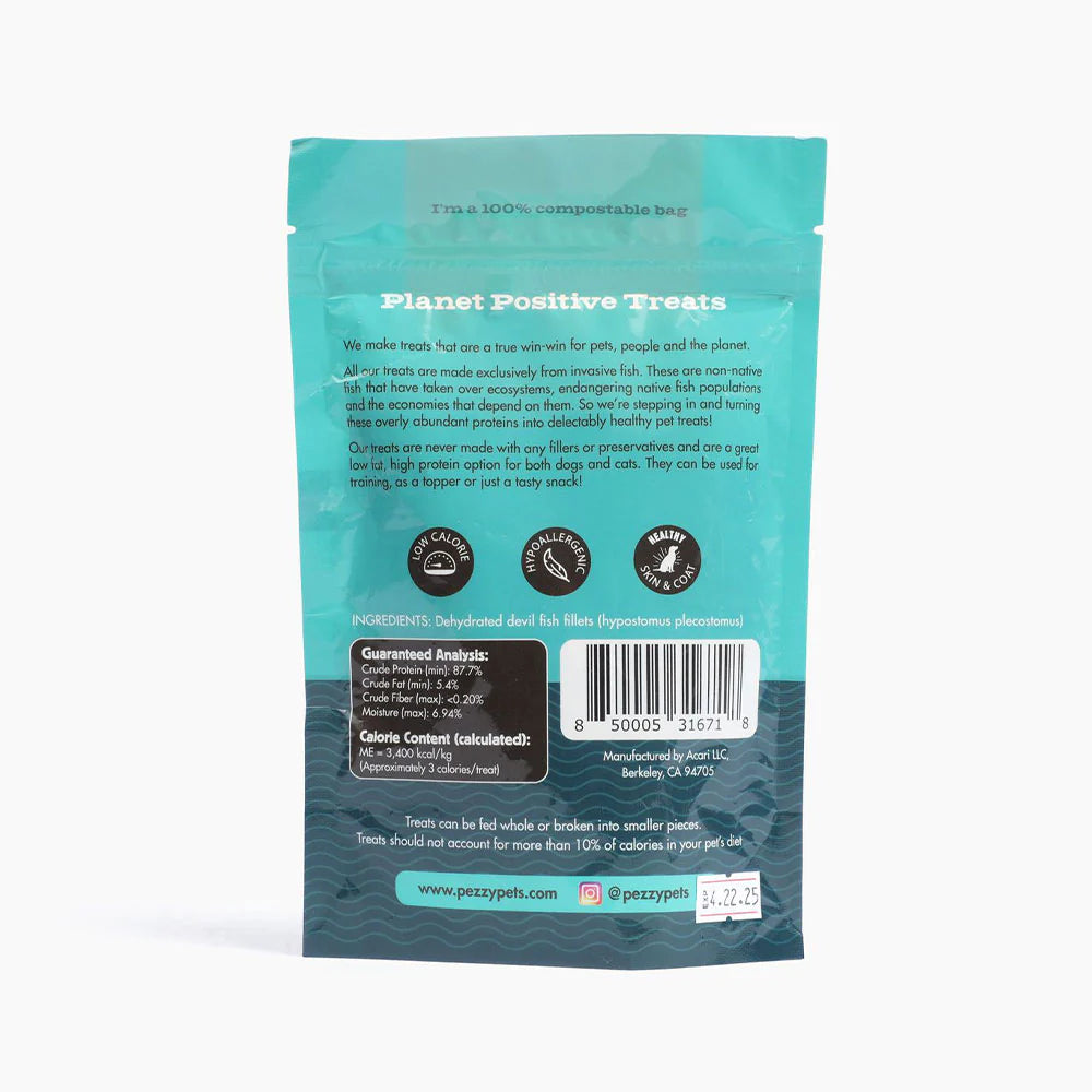 These crunchy jerky strips are made by slowly dehydrating hand-cut slices of wild Mexican devil fish caught by their team of artisanal fishermen. Pezzy's single ingredient treats are just that! Fish and nothing else. The Mexican devil fish is invasive across Mexico and about a dozen countries around the world, decimating native fish populations. Each bite of these fish strips help restore the ecosystem!