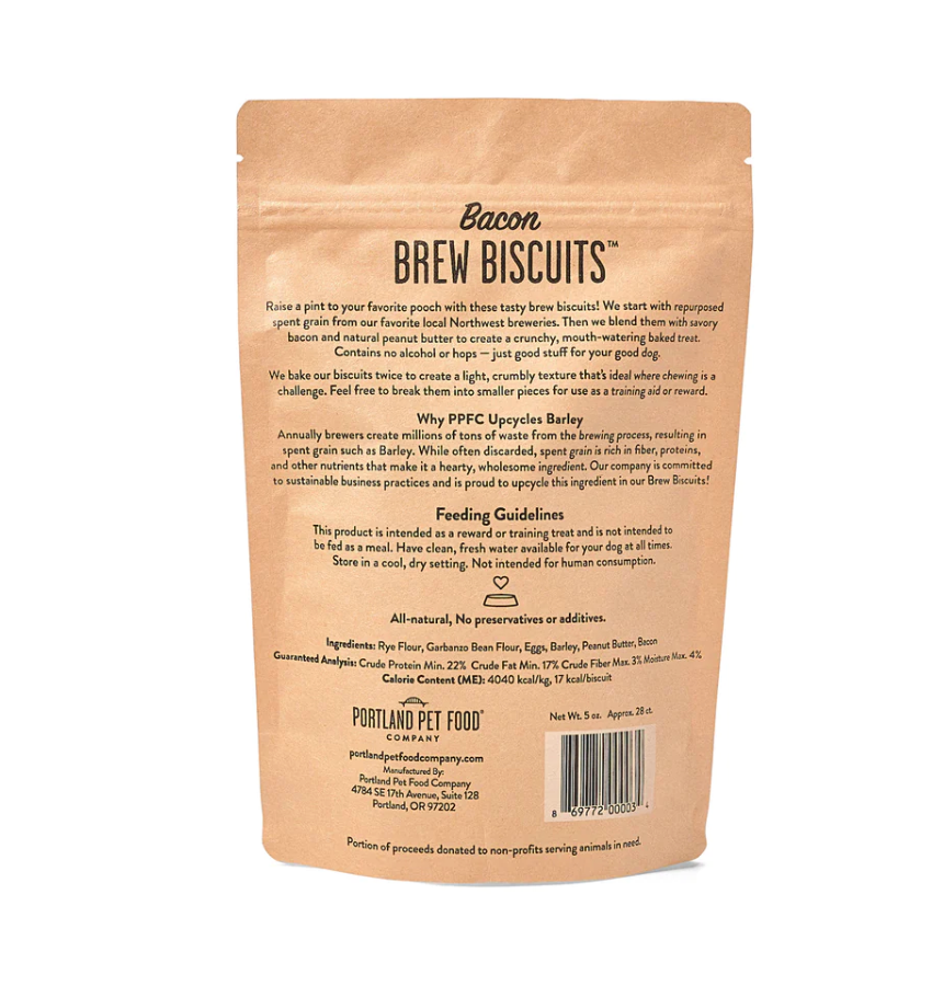 Brew Biscuits with Bacon are made with repurposed spent grains harvested from Portland Pet Food Company's favorite local Portland breweries. These biscuits are the closest your dog can get to enjoying a pint of your favorite beer right alongside you! Brew Biscuits with Bacon contain no alcohol or hops, just the highest quality ingredients sourced directly from local breweries in the Pacific Northwest.