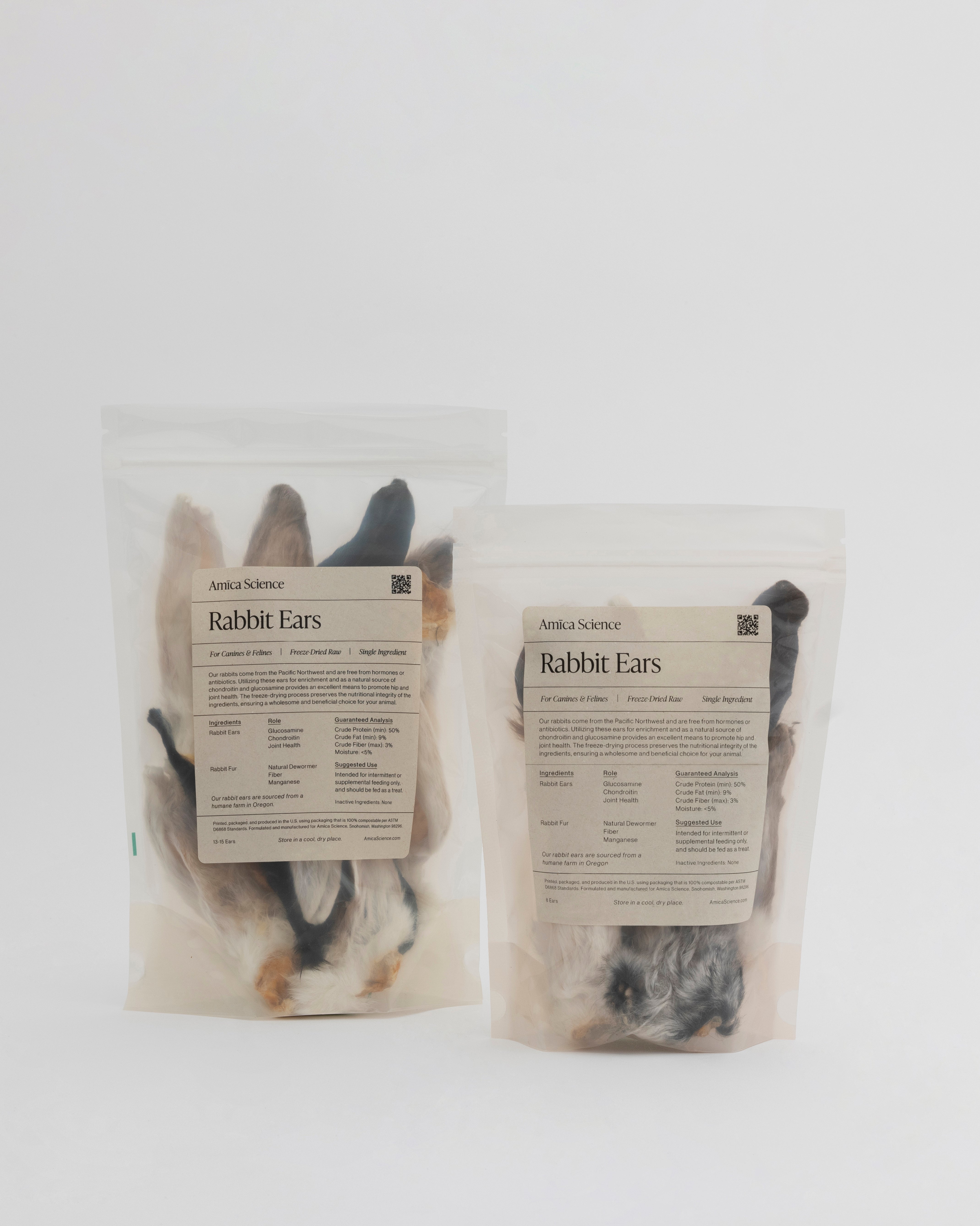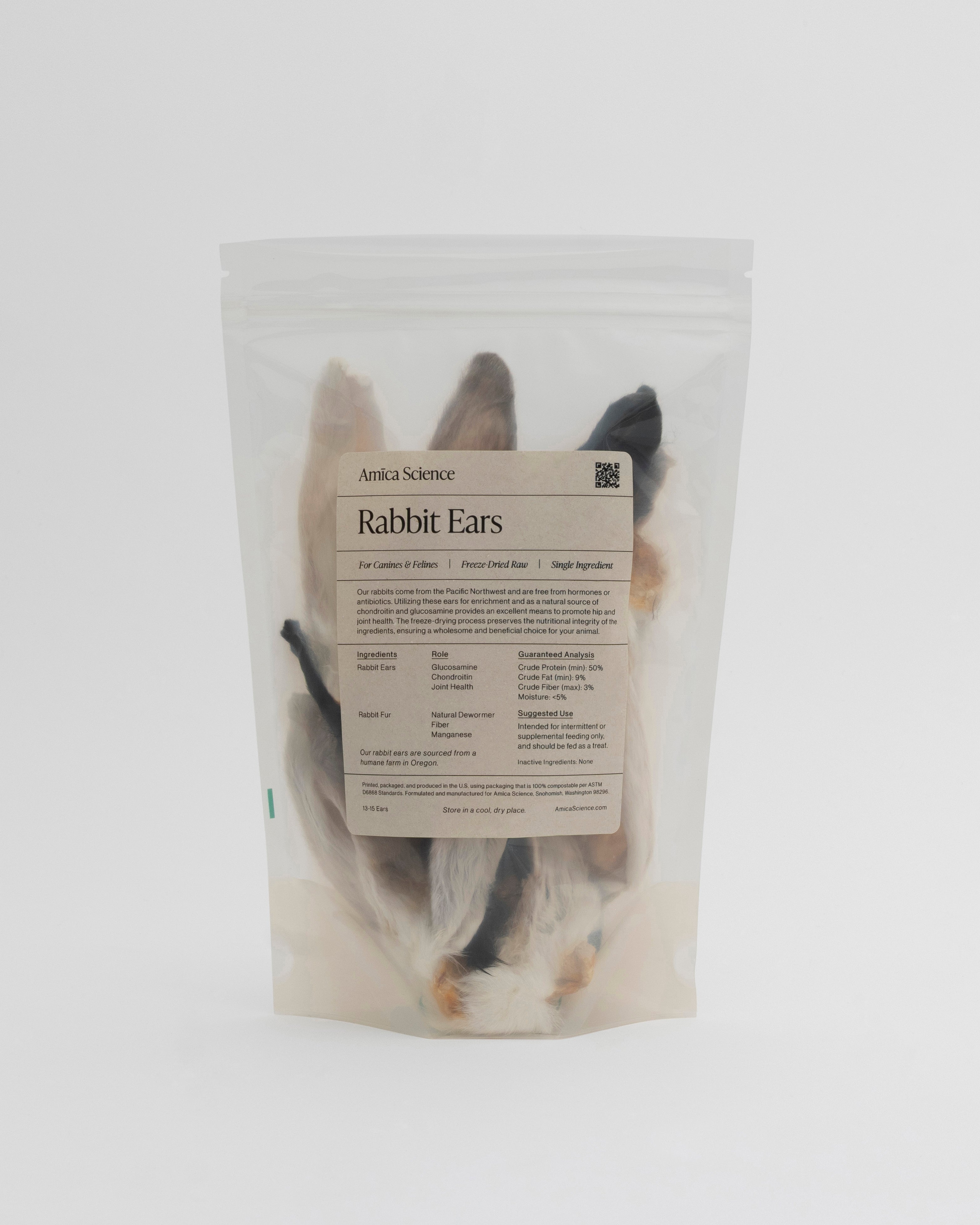 Amica Science's rabbits come from the Pacific Northwest and are free from hormones or antibiotics. Using these ears for enrichment and a natural boost in chondroitin and glucosamine make these an amazing way to encourage hip and joint health. The freeze-drying process preserves the nutritional integrity of the ingredients, ensuring a wholesome and beneficial choice for your animal.