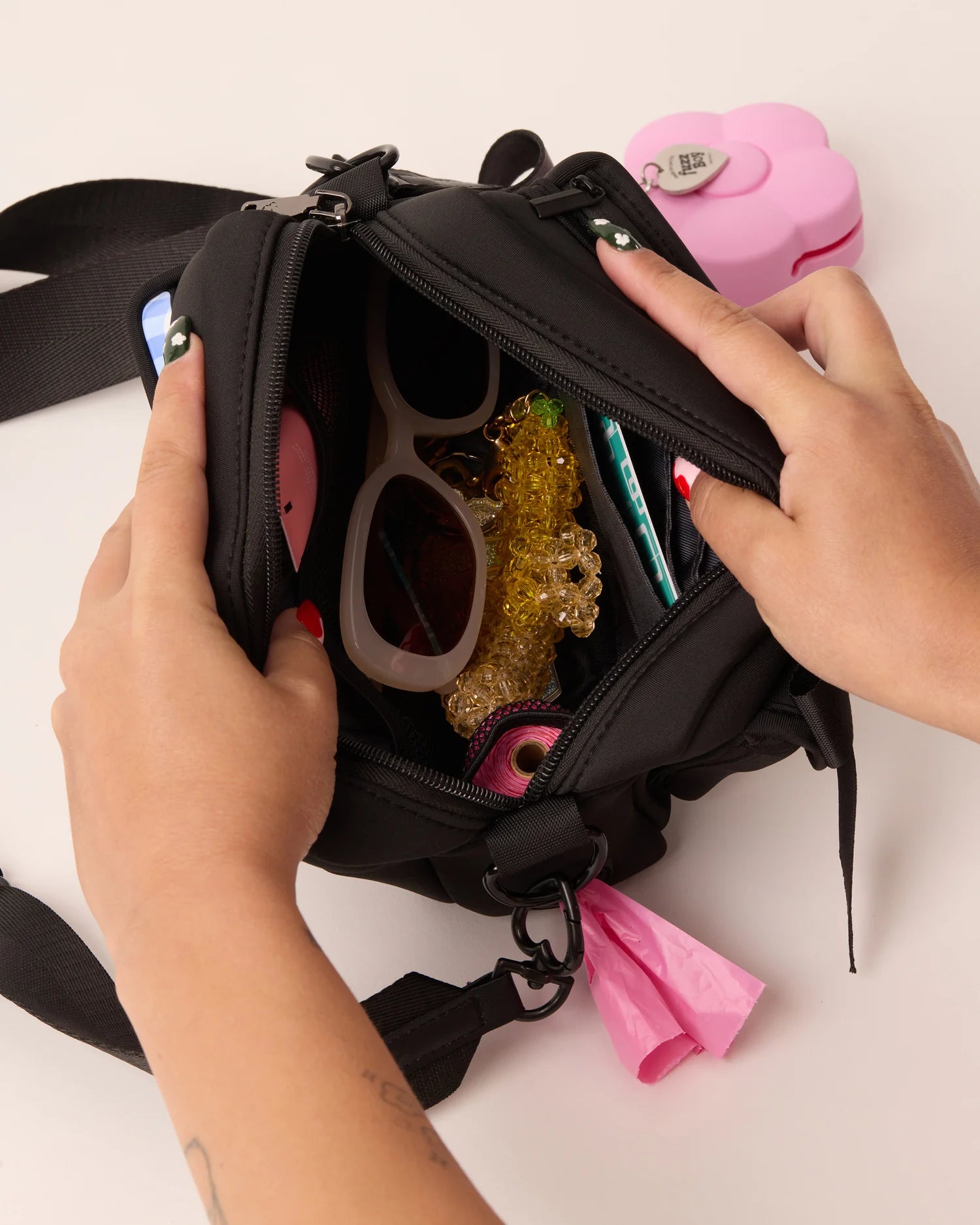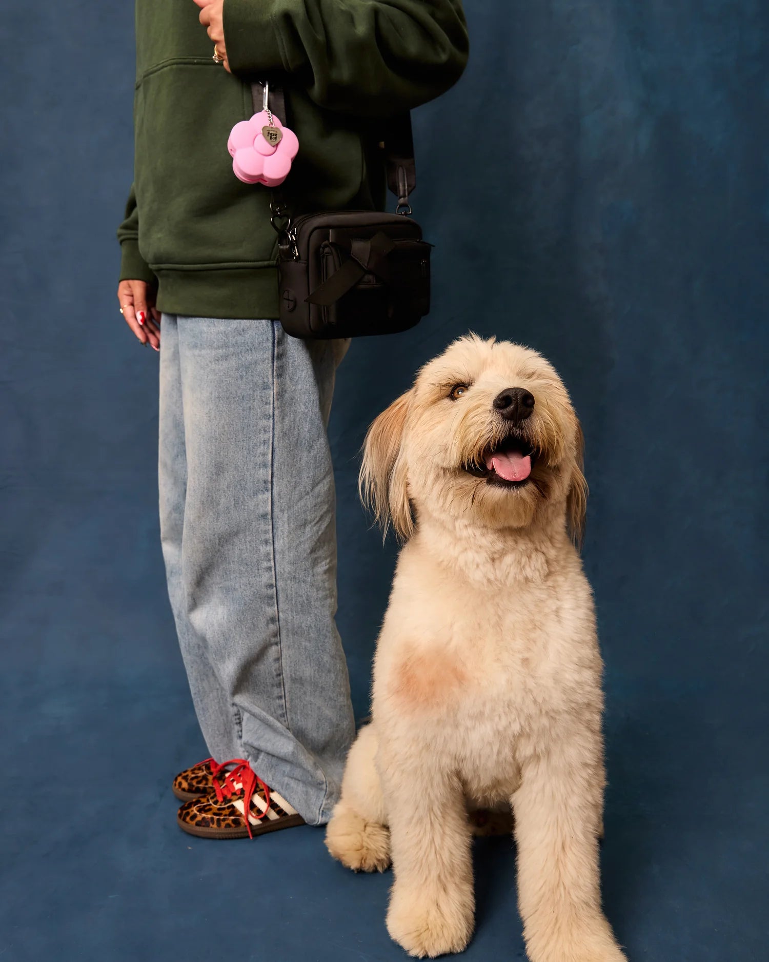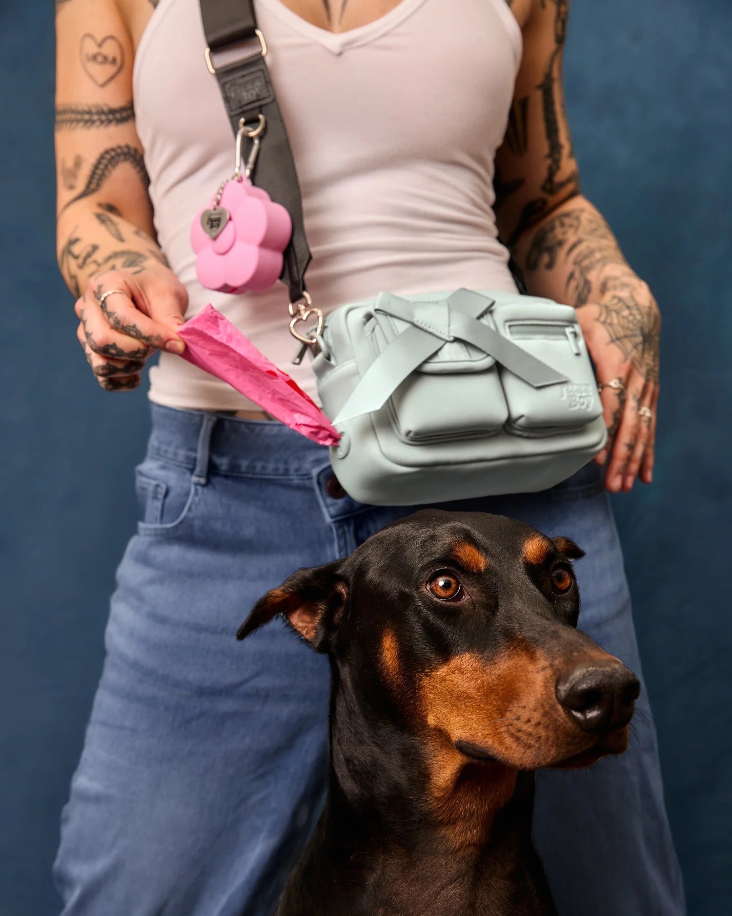 The Fuzzboy Originals Walking Bag is ~the~ dog lover’s lifestyle bag, thoughtfully designed to keep all your necessities at your side. Stylish, organized, and unapologetically practical. Our favorite upgrade: an interior mesh pocket that holds a poop-bag roll and feeds through a silicone dispensing slot, so clean-ups are no-fuss and no prob.